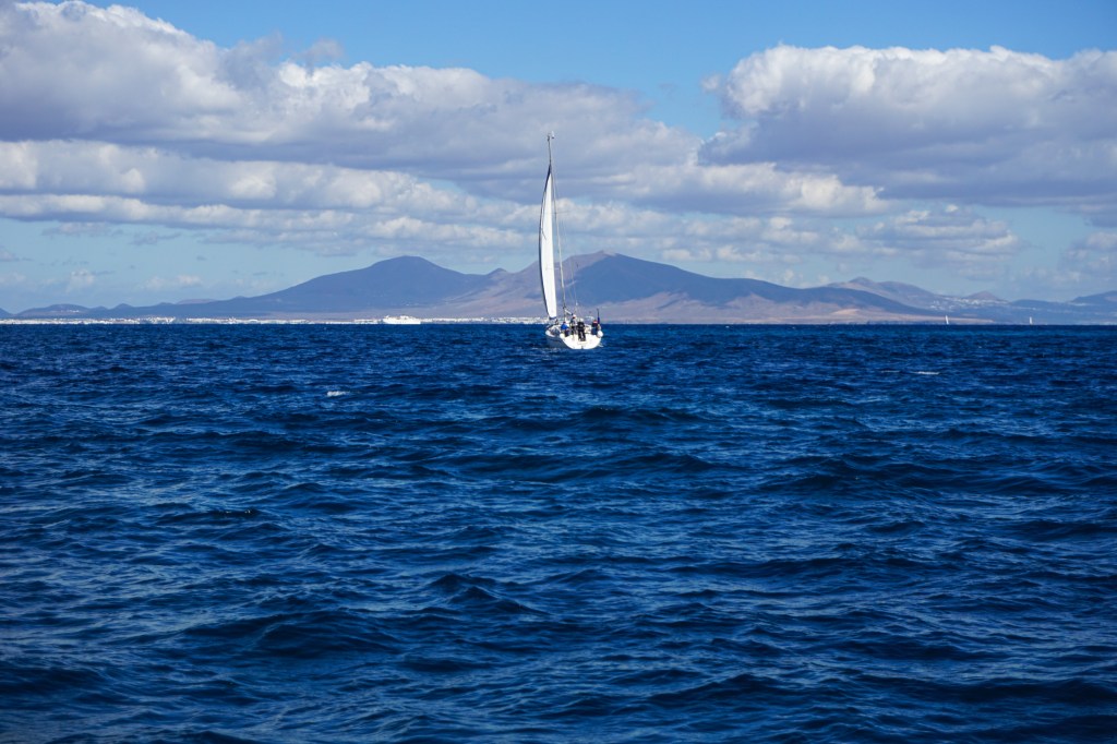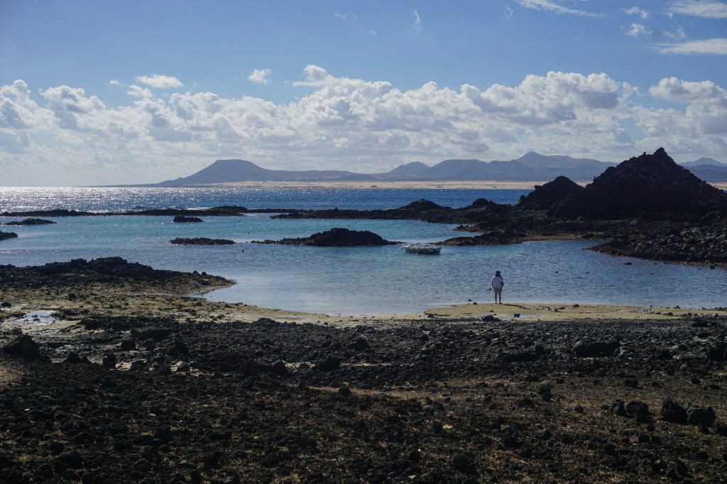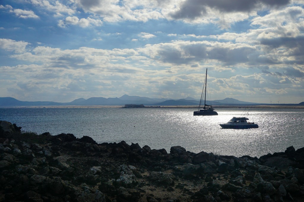 Deshalb packte ich mein Handtuch ein, hängte mir die Kamera wieder um und brach schweren Herzens auf, zurück durch die kleine Ansammlung von Häusern, und ging zwischen rot-braun-schwarzem Gestein den geschlängelten Weg Richtung Hafen und dann zur Playa de la Concha, wo mich ein halbmondförmiger geschützter Strand erwartete, von dem aus ich gerade noch eine kleine Runde schwimmen und auch hier das wunderbare Wasser, die Aussicht auf Fuerteventura, Segelboote und Katamarane im Hafen und die herannahenden Wolken fotografieren konnte, bevor ich auch diesen einzigartigen Strand verlassen und in Richtung Hafen aufbrechen musste.